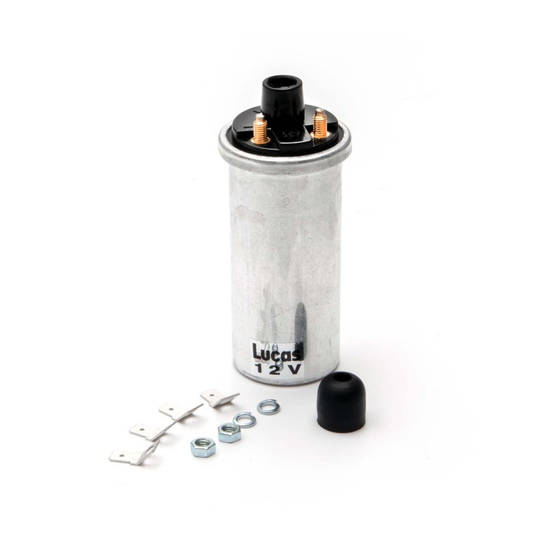 Lucas 47276 coil. 12 volt. Overall height 110mm, body height 85mm, diameter 39mm, primary coil resistance 4.8 ohms and secondary coil resistance 8.9 k/ohms