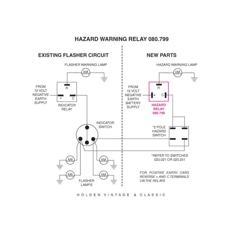 This 12 volt electronic flasher relay can be used to replace existing flasher units that do not require an earth connection. It will also allow you to add the hazard warning function to the existing flasher system on your car, if it is fitted with two or four 21 watt flasher lamps. You will also need a double pole on/off switch such as 020.021 or 020.251 and a 5 watt warning light. The instructions are shown below and can be printed off. This unit is suitable for negative earth systems only.