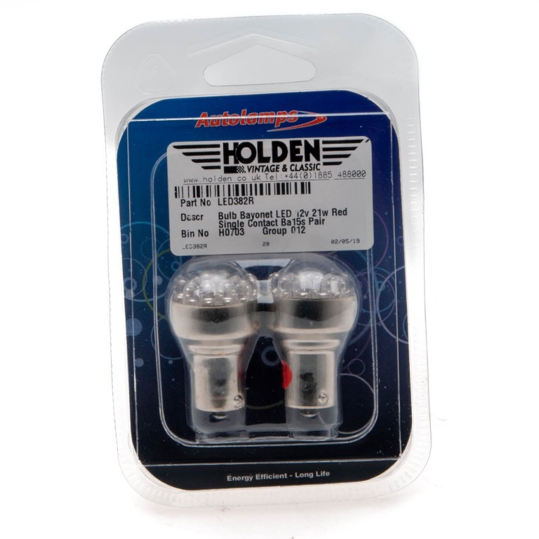 Red LED (Light Emitting Diode) equivalent in size to LLB382 Single Contact Bayonet Bulb but red. 12 volts and 21 watts. Negative earth only. Ba15s cap. LEDs are semiconductor devices that offer advantages over conventional bulbs of increased brightness, lower energy consumption, and longer lifetime.