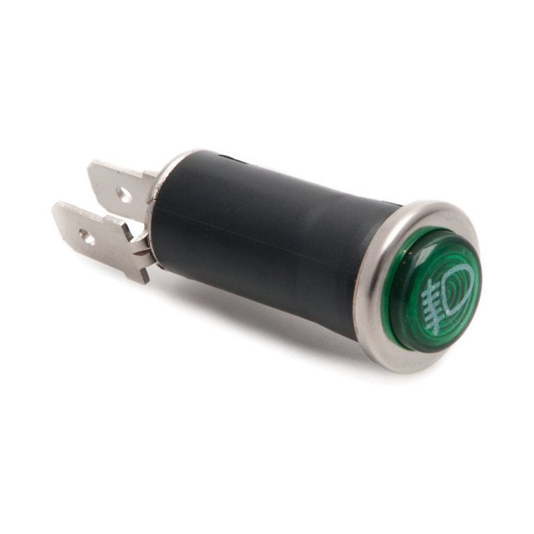 16mm diameter, requires hole 13mm diameter and a bulb LLB281 (order separately). Green lens with fog lamp symbol. A range of warning lamps of this type is available with different symbols and in various colours.
