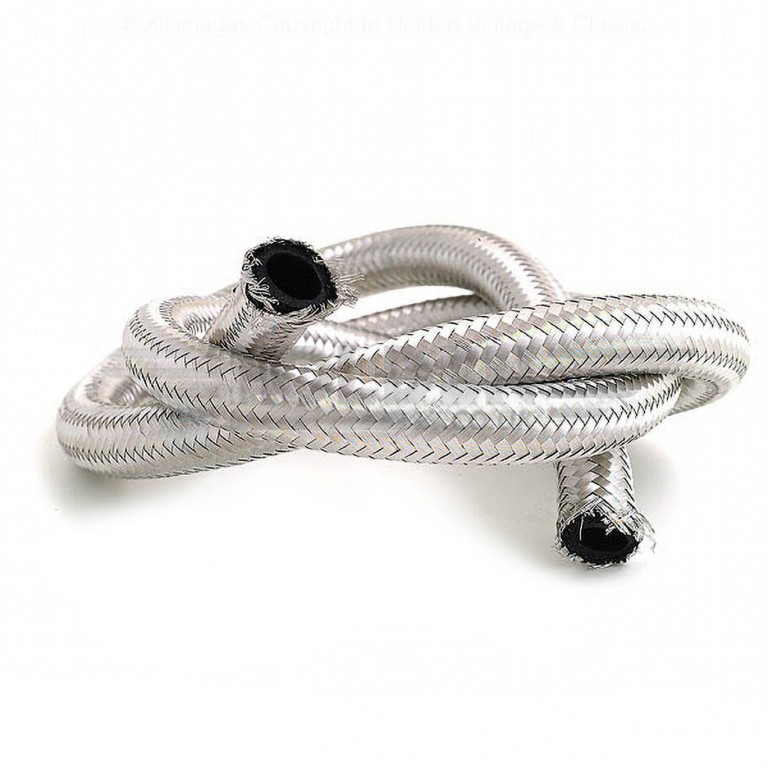 Stocked on the roll and sold by the metre length. SAE S30R7 rubber hose with stainless steel overbraid suitable for leaded, lead substitute, unleaded petrol, petrol with ethanol up to 15%, brake fluid (low pressure), diesel (but not biodiesel), water and air. Recommended for use on low pressure applications up to 20 p.s.i. External diameter 13mm