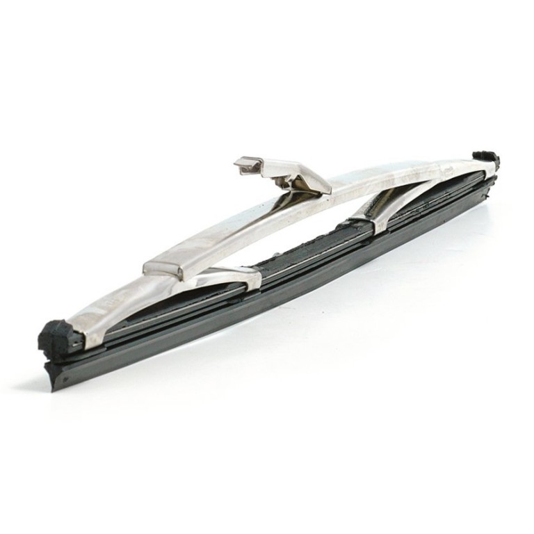 Wiper blade for curved or flat screens. Made by TEX, the only manufacturer of wiper blades remaining in the UK. The rubber is extruded to length in a die and acid etched to provide a surface that slides smoothly over the screen. The backing is stainless steel