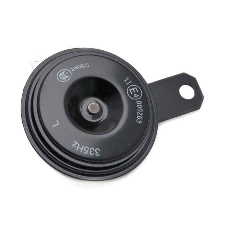 12 volt with 6mm Lucar connectors. 70 mm diameter. 100db. Black finish. Supplied complete with mounting bracket with one 8mm diameter hole. E Marked