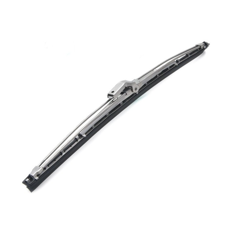 Wiper blade for curved or flat screens. Period style, made in two parts with a hinge in the centre. The backing is stainless steel