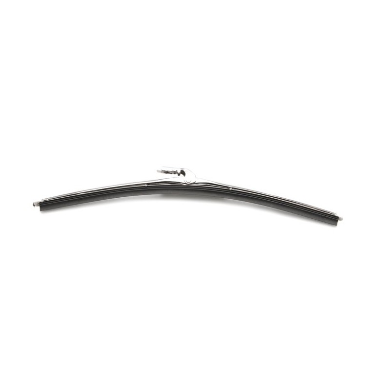 Wiper blade for curved or flat screens. Period style, made in two parts with a hinge in the centre. The backing is stainless steel