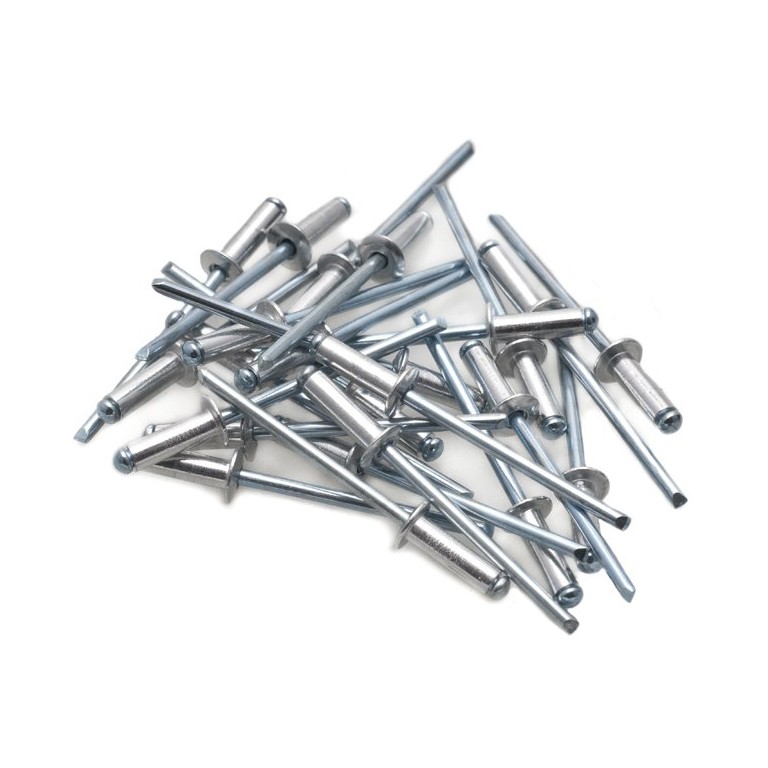 3.2mm (1/8 in) diameter, the flange is 6.2mm diameter and the length is 10mm (11/32 in). Suitable for riveting thicknesses from 5.5 to 7mm. For a Pop Rivet Gun refer to 096.886