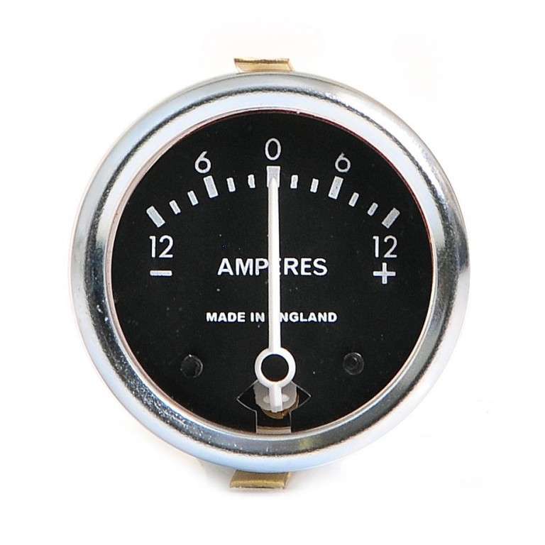 White graphics on a black quadrant dial reading from -12 to +12 amps. Chrome rim. Fits panel 010.529