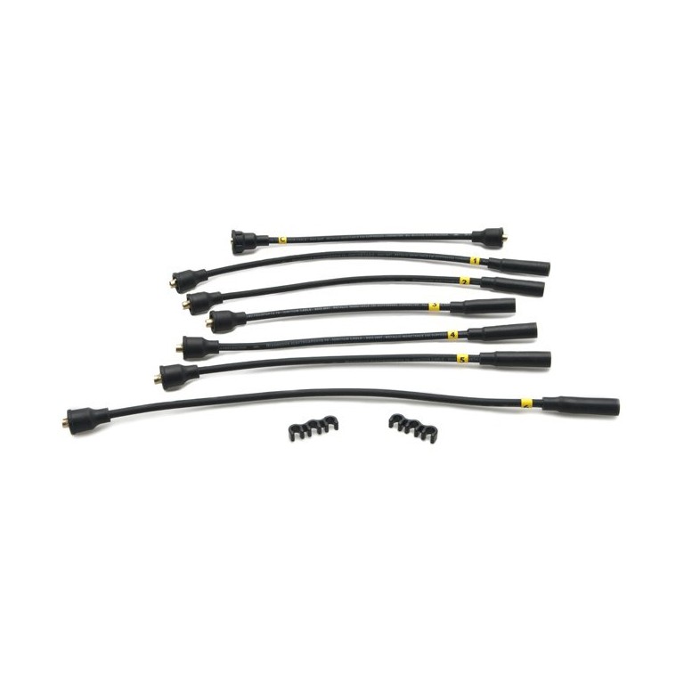 7mm Ignition lead set features Magnecor's stainless steel conductor wound on a ferromagnetic base, providing radio frequency interference suppression and a capacitive reserve to help ignition coil regeneration at high engine revolutions, surrounded by an EPDM insulator with fibreglass reinforcement, covered by high temperature resistant silicone rubber. This set is for the Austin Healey 3000, using conventional 'Push-in' distributor and coil connections. The coil lead supplied is 11.5 in (29cm) long