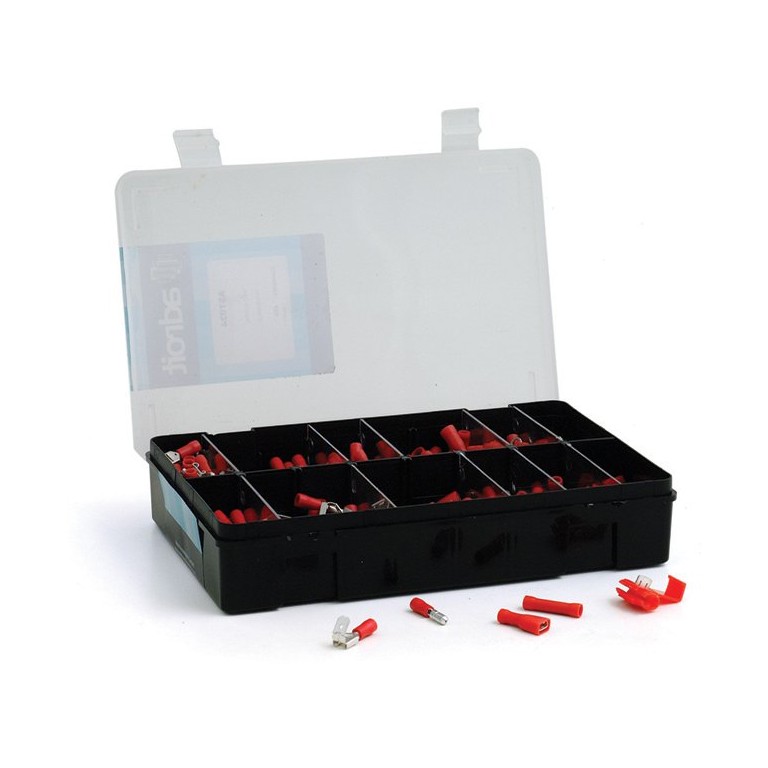 A selection of RED pre-insulated crimp type connectors packed in a plastic box, with clear lid. Red connectors are for use with 14/0.30mm wire. a) 30 male and 50 female 6.4mm connectors blade connectors b) 25 fully insulated female 6.4mm connectors c) 40 'piggy back' 6.4mm connectors d) 35 4.8mm and 30 2.8mm female connectors e) 40 male and female bullet connectors f) 50 5mm eyelets and 20 quick connectors