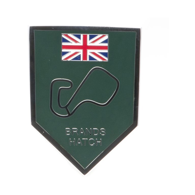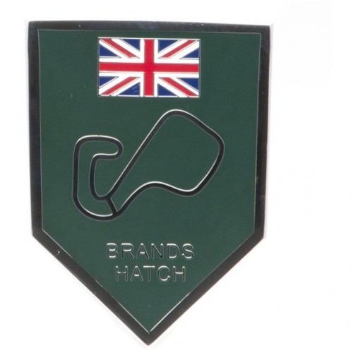 An enamelled adhesive shield featuring an outline of the Brands Hatch race circuit on a dark green background, with the Union Jack flag above. Measuring 45 x 60mm