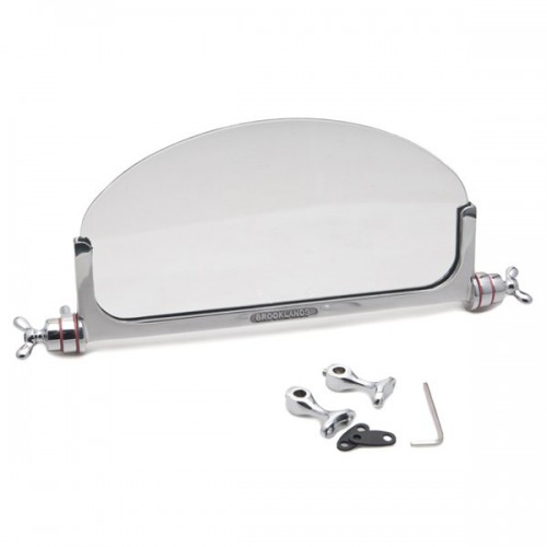 Triplex laminated glass conforming to MSA competition regulations. Polished aluminium frame with chrome fittings. Overall width 406 mm (16). Glass is 300 x 145mm (Approx 12 x 6 ) Centres between mounting points is 325mm (13) and the supplied posts will stand the screen roughly 35mm (Approx 1.5) above a flat panel For this part number the glass is cut to a radius at the top. A square cut version is available.