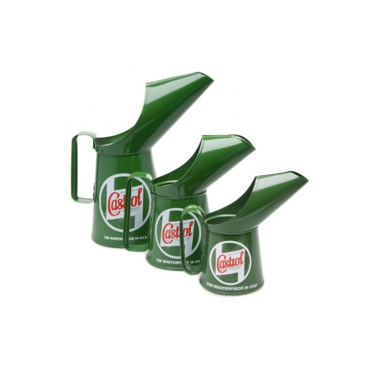 Set Of 3 Castrol Pouring Cans - Vintage Castrol tin pouring cans featuring the Castrol logo. Do you remember the time when those green CASTROL Pouring Cans or jugs were to be seen on almost every garage forecourt. These are fully useable for their original purpose, and make a great gift. they are often used as a desk tidy for pens etc. Whatever their use, they are a great bit of motoring nostalgia.