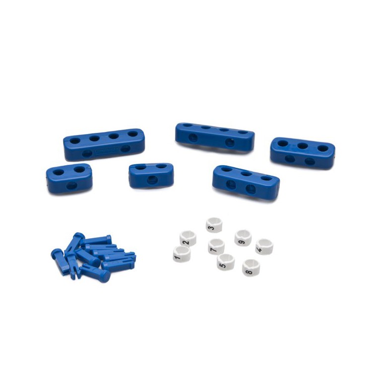 Comprises six clamps in blue plastic, each of which clips together using the pegs supplied. Two for four leads, two for three and two for two. Also included are cable markers for identification of ignition leads, numbered 1 to 8. Also a sachet of silicon compound for application to coil and distributor covers to make a moisture seal on these connections. For equivalent in red refer to 030.097