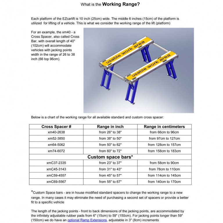 Part of E-Z Car Lift. Comprises two cross spacer bars, a drive bar and a slave bar, a set of wheels and everything you need to assemble the lift. Measure the width across the jacking points on your car and select the appropriate width of lift you require, This set provides a working range of 66 to 97cm (26 to 38 in). There are a number of optional extras available see Part Nos 091.970, 091.971, 091.975, 091.990. For more information you can refer to the American manufacturer's web site - ezcarlift.com. Refer also to that web site for assistance in selecting the correct cross spacer kit for your car. This one has the American Part No. xm40 on their application list