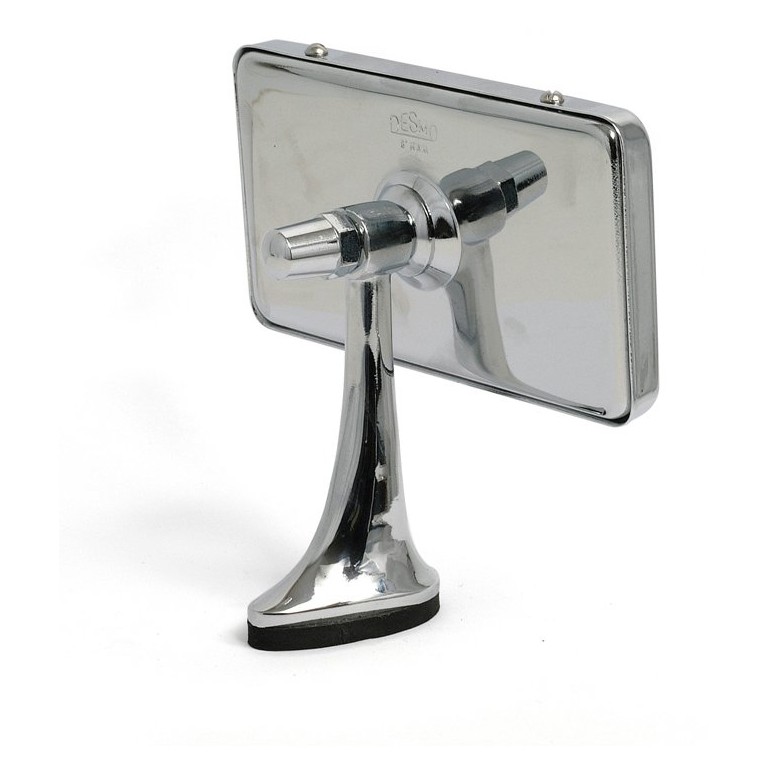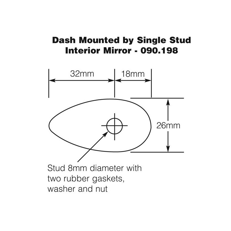 Chrome and stainless steel, mirror of approximately 120 x 65mm and 118mm in overall height. Installed using a single 8mm dia. stud at the base. Supplied with the stud, a nut & washer and a base gasket.