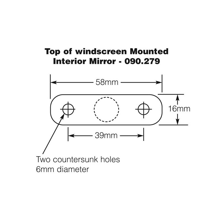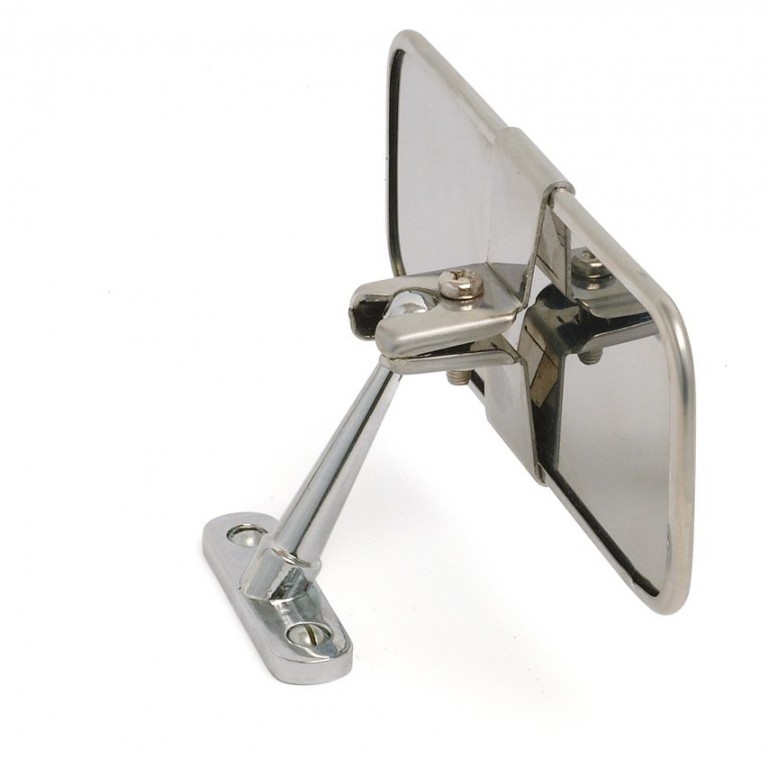 Chrome and stainless steel mirror of approximately 150 x 60 mm. The ball joint between the mounting arm and the mirror head moves through 180 degrees, so this mirror is suitable for mounting either at the top of the windscreen or on the dash. When dash mounted overall height would be 90 mm. 39 mm hole centres