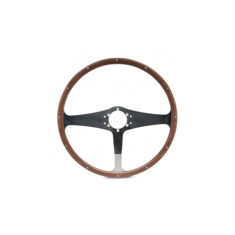 As originally supplied by Moto-Lita to VW Derrington for the Jaguar Mk II. Hand-built from cross-laminated wood, bonded and riveted to a one-piece, heavy-gauge, hand-polished, aluminium alloy frame with three plain spokes. The underside of the rim has 36 finger notches.