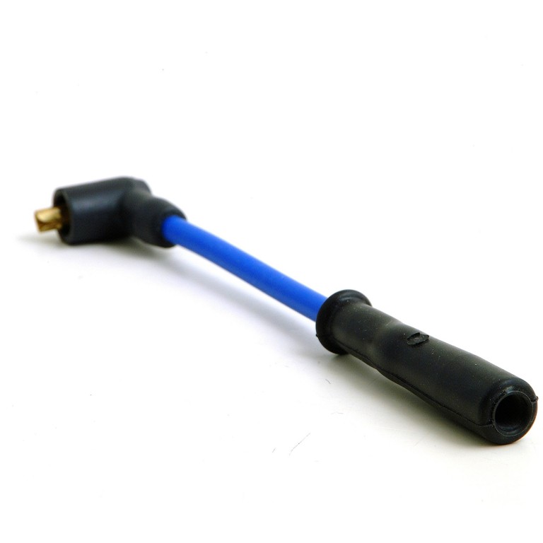 This Ignition Lead has an uprated high-tech stainless steel wire-wound conductor of 2mm diameter which will properly suppress both RFI and EMI on all vehicles without reducing spark current or deteriorating with use. The extremely flexible high-tear strength silicone insulating covers allow leads to be fitted into Lucas or similar distributors with push-on connections and provides excellent terminal retention. This end is angled at 90 degrees to enable the lead to be fitted in tight spaces. The other end clips firmly onto all normal spark plugs. External diameter 8 mm. Maximum service temperature 260 deg C. Made for us by Magnecor