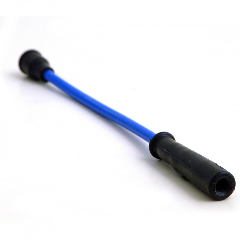 This Ignition Lead has an uprated high-tech stainless steel wire-wound conductor of 2mm diameter which will properly suppress both RFI and EMI on all vehicles without reducing spark current or deteriorating with use. The extremely flexible high-tear strength silicone insulating covers allow leads to be fitted into Lucas or similar distributors with push-on connections and provides excellent terminal retention. The other end clips firmly onto all normal spark plugs. External diameter 8 mm. Maximum service temperature 260 deg C. Made for us by Magnecor