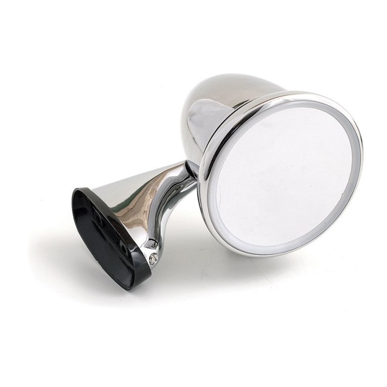 A chromed racing door mirror specifically designed to look good on Minis. With flat glass. On late Minis you can take the original mirror off and fit this mirror using a mounting kit. The corresponding left hand door mirror and a flat glass version are also available.