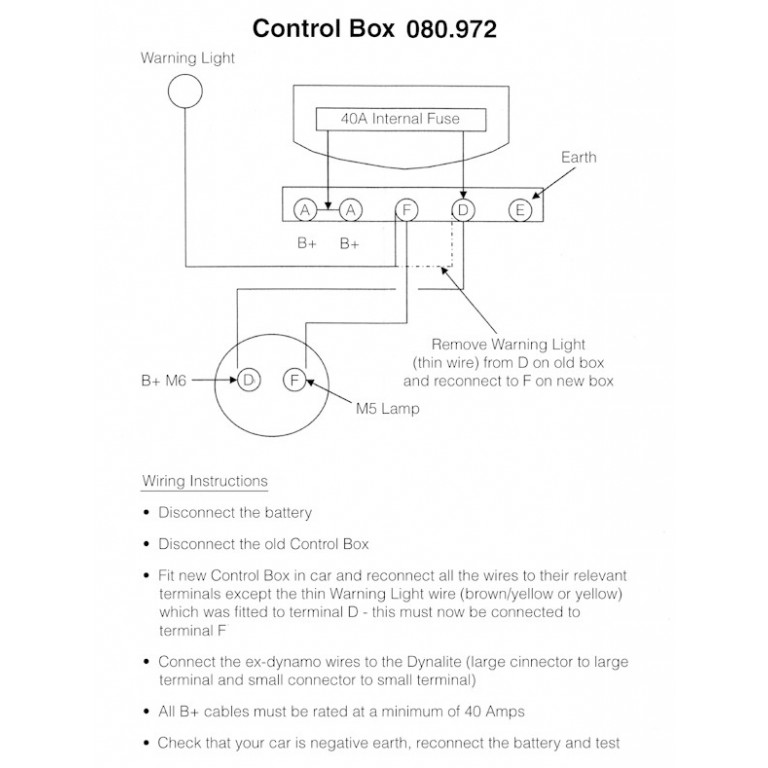 Dynalites - the alternator that looks like a dynamo - has a built in regulator. This means that you have two alternatives in respect of the 'old' control box: 1) Remove your old control box and wire the Dynalite in accordance with the instructions provided or 2) Remove the old control box and fit this dummy box which is prewired to suit the Dynalite and allows all the wires to be reconnected in accordance with the wiring instructions below. It also ensures that the 'dynamo' warning light on your dash continues to function normally. This dummy box, which is based on the Lucas RB106 type Control Box, contains a fuse to protect your wiring loom