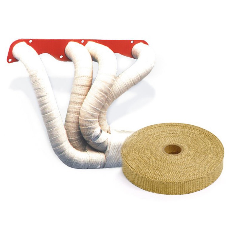 For insulating exhaust systems. Gives protection from burns. Retaining heat in the exhaust pipes, the exhaust velocity stays high which improves the scavenging effect. Reduces under bonnet temperatures allowing the engine intake to receive a cooler charge. Length is 15 metres. Secured using Stainless Steel Strap Kit 091.444, and by using High Heat Coating 091.376 or 091.377 on the Wrap the life of the material will be increased. For 50mm wide refer to 091.441.