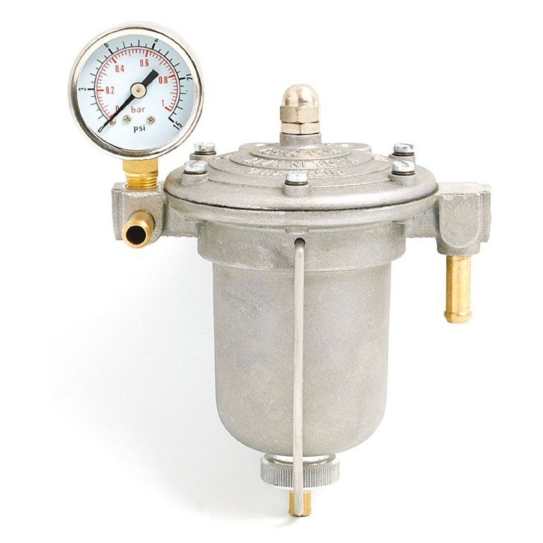 In addition to the filter element, this contains a membrane which reacts to provide a steady flow of fuel to improve running, particularly idling. The membrane has an adjustment enabling you to regulate it within limits to obtain the best idling of your engine. This model has an alloy bowl and is suitable for engines 130 to 200 bhp. Use 5/16 push on fuel pipes. Supplied with a 1 bar pressure gauge which can be removed and blanked off with the plug provided. For the spare filter element refer to 015.179, for the filter seal refer to 015.259, for the bowl seal refer to 015.258 and for a spare pressure gauge refer to 015.893