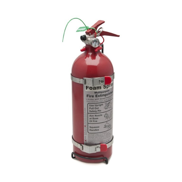 Uses Aqueous Film Forming Foam (AFFF), a low expansion foam which forms a vapour sealing film over hydrocarbon fuels. Supplied complete with bracket and quick release over centre strap. 108 mm diameter and 373 mm overall height. This capacity is often specified in RAC and Classic Rallying Regulations.