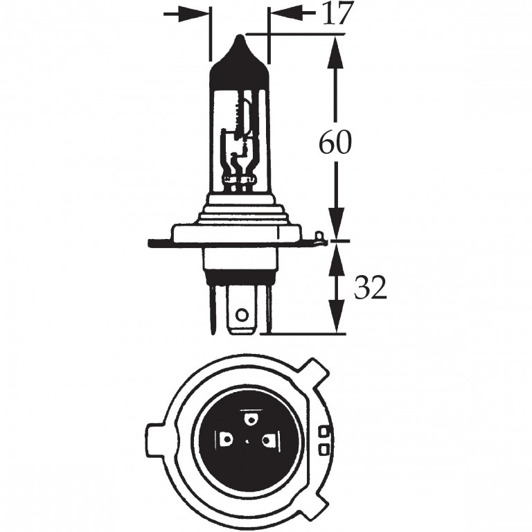 H4 60/55W Halogen Bulb for Headlamps. P43t cap with triple Lucar connectors LLB472