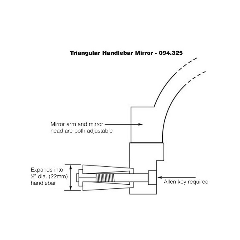 Fits inside the end of the Handlebar. The Mirror is held securely by an expanding sleeve which has equal expansion over its full length, thus it will not cause distortion to the handlebar tube. This Mirror is suitable for right and left hand sides. Supplied with convex glass. For other head shapes refer to 094.323 & 094.339