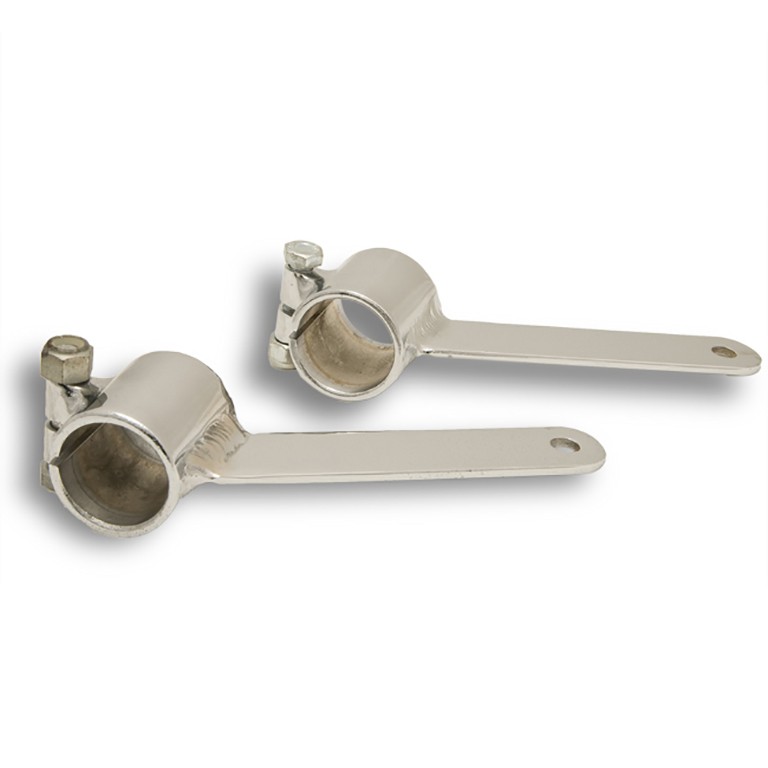 Fits to forks of 1 1/4 in (approx. 32mm) diameter. Has 5/16 in (8 mm) holes for headlamp mounting. Length approx 6 3/4 in (171mm) and height on forks 1.8 in (46mm)