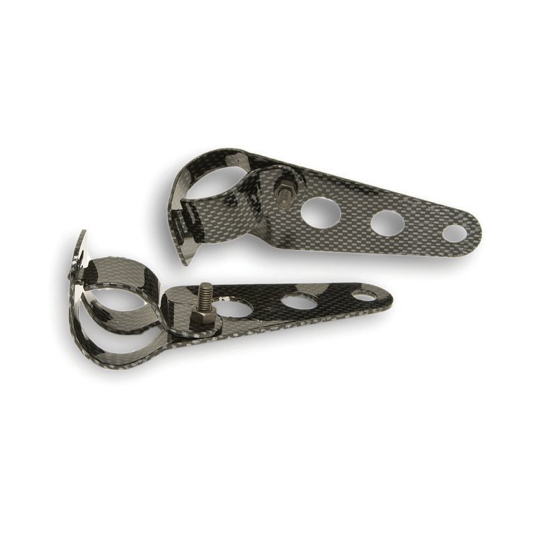 Adjustable to fit front forks 30-38 mm diameter. Screw adjustment. Each has two lightening holes plus hole 7/16' (11 mm) diameter for headlamp mounting. Overall length approx 5 3/4' (146 mm). Although made of steel it has been given the look of carbon fibre