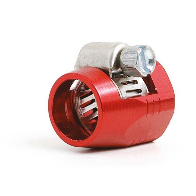 For cotton over braided or stainless steel covered Fuel Hoses 015.218 and 015.288. Slip over end of hose and tighten, the finisher hides both the clip and the end of the hose. For the blue one refer to 091.605
