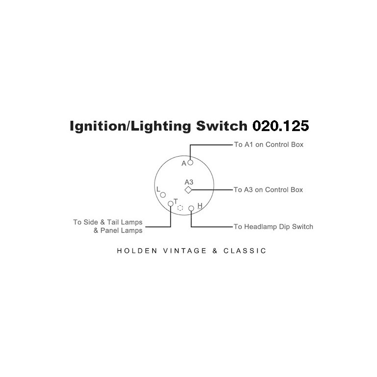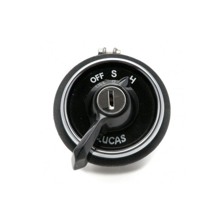 Ignition and Lighting Switch, OFF-SIDE-HEAD. Requires 52 mm diameter hole and secures with clip included. Screw type connections for the wires. Two keys supplied. Lucas PLC5 switch, 34057, where the position markings are printed on the outside of the switch body. A later version with a 'window' to indicate the switch position is also available.