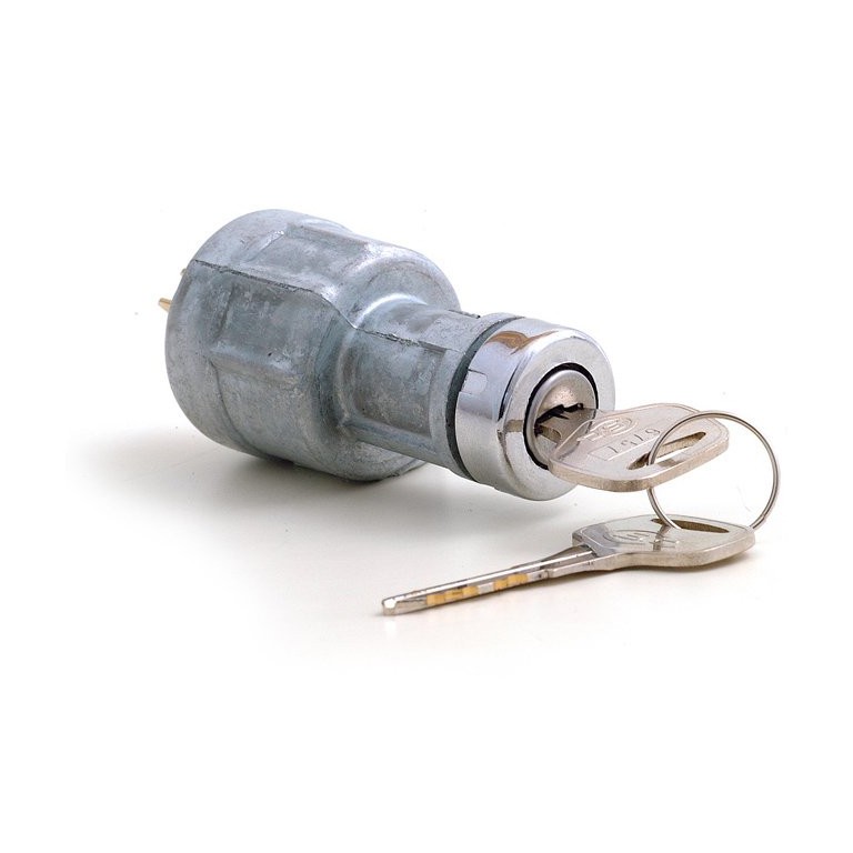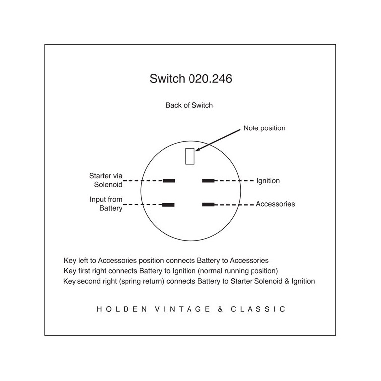 Combined ignition and starter switch with chrome finishing surround and Lucar connectors. Requires 18 mm diameter hole. Supplied with two keys. This Switch has four positions : 1, Accessories, 2, Off, 3, Ignition, 4, Starter. The key springs back from the Starter position to the Ignition position when released. Key is removable only in the Off position