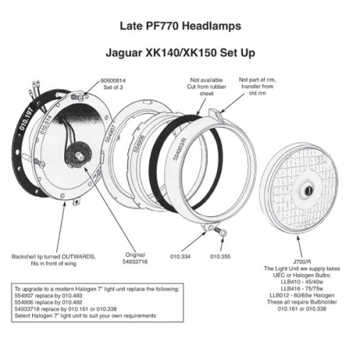 Head lamp rim as fitted to Jaguar XK140/150. High quality reproduction of Lucas 554903 chrome plated on copper. Screw fitting. Measures 227 mm external diameter. Scroll down for more information