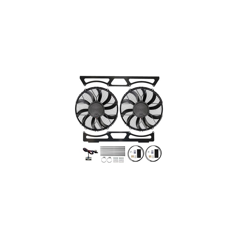 2x 12" High Power Suction fans, Laser cut aluminium anodised fan mounting brackets, 35mm Revotec Electronic fan controller designed for Land Rovers with an extended loom, Earth wire kit, Bolts & fittings.