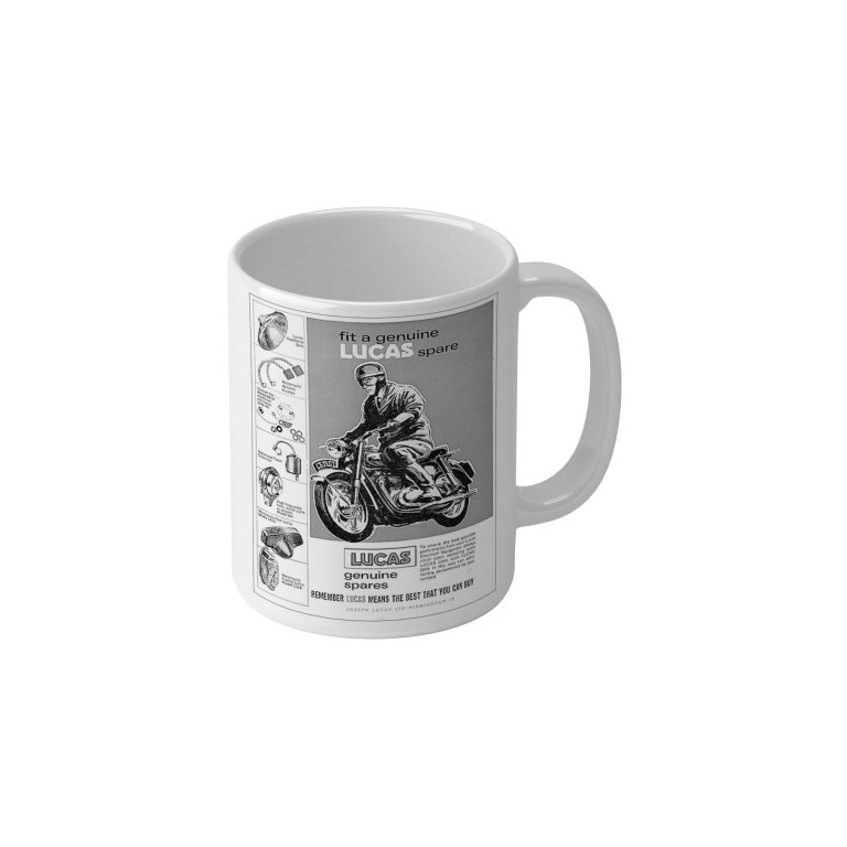 Lucas Motorcycle Spares Mug (Single Mug) 330ml ceramic mug with a full colour wrap around print. Dishwasher resistant up to 800 wash cycles at 45°C. Bright white in colour and with a high gloss finish.