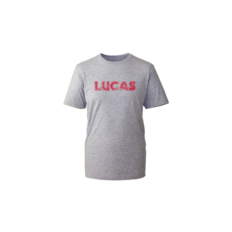 Lucas Distressed T-Shirt Lucas distressed DTG printed t-shirt. Heather Grey in size 3 Xtra Large. Fashion fit. Ribbed collar. Taped neck. Side seams. Twin needle stitching.100% organic combed ringspun cotton. 145gsm.
