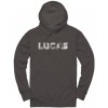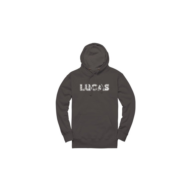 Lucas Distressed Pullover Hoodie Charcoal in size Large. Lucas distressed DTG printed to front. Kangaroo pocket with concealed phone pocket. Soft feel fabric with stretch for extra comfort. Self Colour waffle hood lining. Twin needle stitching detail. Fashionable long cuff made with 2by1 rib. 280gsm fabric. 35/65 Polycotton blend.
