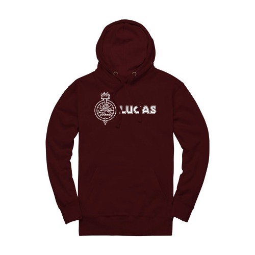 Lucas Pullover Hoodie Burgundy in size Large. Lucas DTG printed to front. Kangaroo pocket with concealed phone pocket. Soft feel fabric with stretch for extra comfort. Self Colour waffle hood lining. Twin needle stitching detail. Fashionable long cuff made with 2by1 rib. 280gsm fabric. 35/65 Polycotton blend.