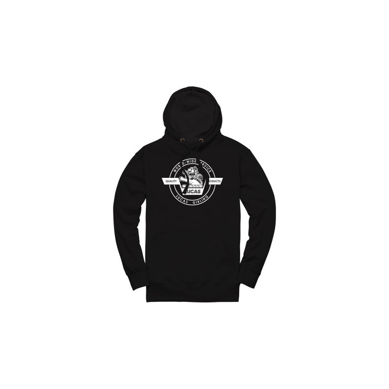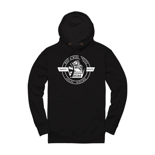 Lucas Lion Pullover Hoodie Black in size Large. Lucas Lion DTG printed to front. Kangaroo pocket with concealed phone pocket. Soft feel fabric with stretch for extra comfort. Self Colour waffle hood lining. Twin needle stitching detail. Fashionable long cuff made with 2by1 rib. 280gsm fabric. 35/65 Polycotton blend.