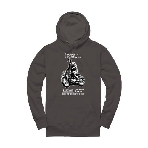 Lucas Motorcycle Spares Pullover Hoodie Charcoal in size Large. Lucas Motorcycle Spares DTG printed to front. Kangaroo pocket with concealed phone pocket. Soft feel fabric with stretch for extra comfort. Self Colour waffle hood lining. Twin needle stitching detail. Fashionable long cuff made with 2by1 rib. 280gsm fabric. 35/65 Polycotton blend.