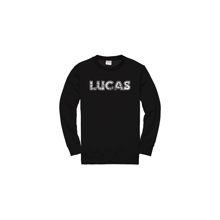 Lucas Distressed Sweatshirt Black in size Large. Lucas distressed DTG print to front. Soft feel fabric with stretch for extra comfort. Twin needle stitching detail. Fashionable long cuff made with 2by1 rib. 280 gsm fabric. 35/65 polycotton blend.