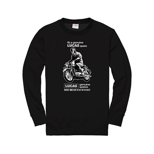 Lucas Motorcycle Spares Sweatshirt Black in size Large. Lucas Motorcycle Spares DTG print to front. Soft feel fabric with stretch for extra comfort. Twin needle stitching detail. Fashionable long cuff made with 2by1 rib. 280 gsm fabric. 35/65 polycotton blend.