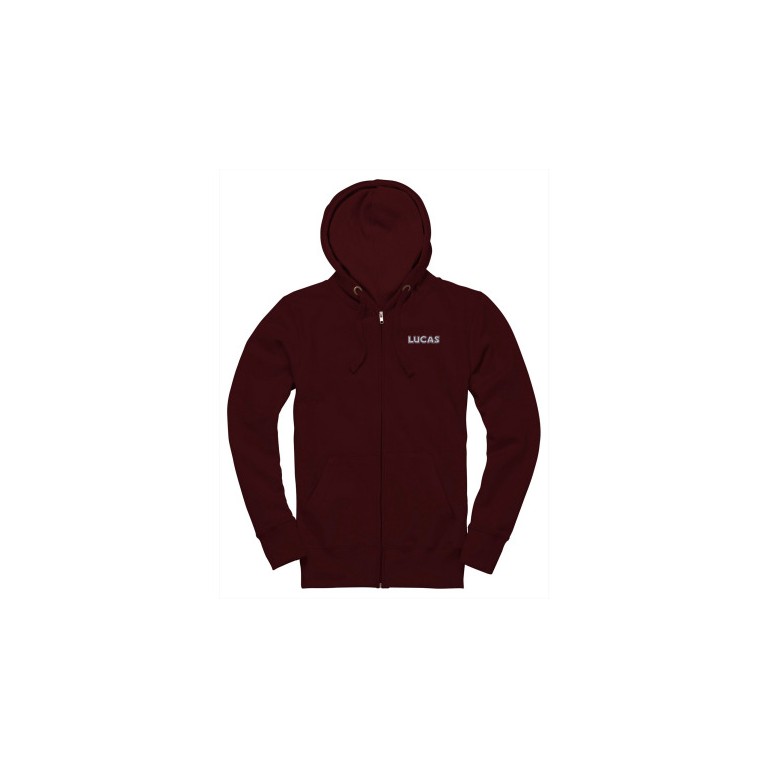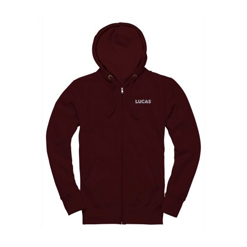 Lucas Text Zip-Up Hoodie Burgundy in size Large. Embroidered Lucas Text logo to the left chest. Kangaroo pocket with concealed phone pocket. Soft feel fabric with stretch for extra comfort. Self Colour waffle hood lining. Twin needle stitching detail. Fashionable long cuff made with 2by1 rib. Self colour nylon zip with zip cover.280gsm fabric. 35/65 poly cotton blend.
