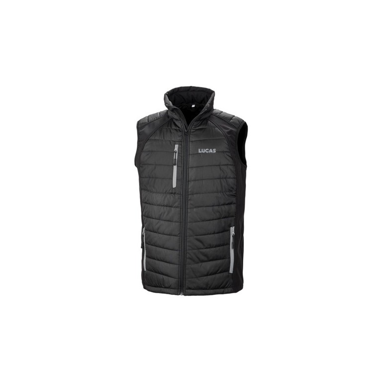 Lucas Text Padded Softshell Gilet Lucas text logo embroidered to left chest. Black/Grey in size Large. YKK front zip with chin guard. Contrast colour pocket zips. Stand-up padded collar. Black zip pulls. Padded body. Hang loop. REPREVE® performance recycled padding using environmental-friendly materials made from recycled plastic bottles and post-industrial waste offering a sustainable equivalent to conventional yarns. TOPGREEN® environmental-friendly softshell polyester. JAIREN recycled waste and scrap material usage. Both recycled plastic and fabric waste used for this style. 280gsm material. 100% polyester