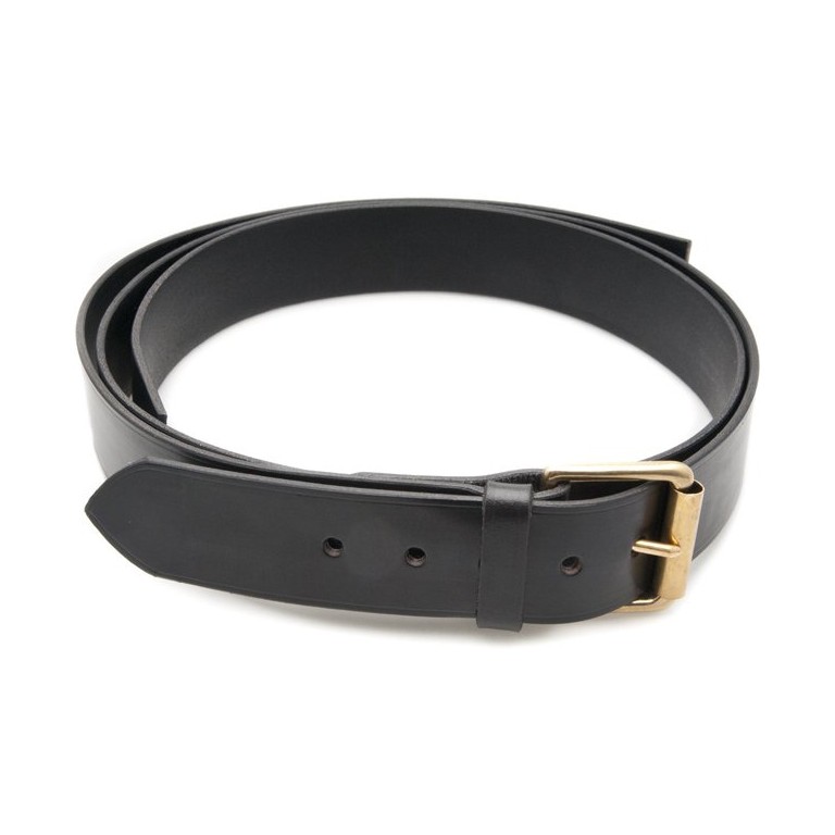 Leather Strap 44mm (1 3/4 in) wide with substantial brass buckle. It comes in two halves, the half with the buckle and the half with the holes to suit the buckle. As supplied the length is adjustable via the buckle from 2.055 metres (6 ft 9 in) to 1.880 metres (6 ft 2 in) but you can shorten it further by cutting and trimming the ends