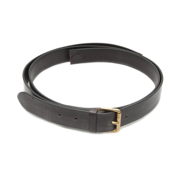 Leather Strap 38mm (1 1/2 in) wide with substantial brass buckle. It comes in two halves, the half with the buckle and the half with the holes to suit the buckle. As supplied the length is adjustable via the buckle from 2.055 metres (6 ft 9 in) to 1.880 metres (6 ft 2 in) but you can shorten it further by cutting and trimming the ends