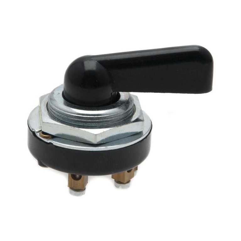 Off-on-on-on for lighting. Supplied with lever and nut as shown. Suitable for fitting to a metal panel, requiring a hole 25.4mm diameter (1 in). Screw type terminals at rear